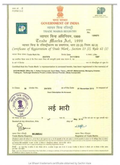सचिन वाझे यांनी सहा ट्रेडमार्क रजिस्टर केले होते. यामध्ये "LAPCOP", "KNOW YOUR LAW", "A Fascinating Side of Life" आणि "LAI BHAARI" याचा समावेश होता. लय भारीवरून रितेशला नोटीस पाठविण्यात आली होती. 2014 मध्ये रितेशचा एक सिनेमा याच नावे आला होता.