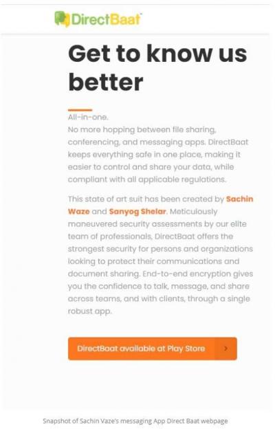 हे अॅप 2018 मध्ये लाँच केले होते. तंत्रज्ञान विशेषज्ञ संयोग शेलारच्या मदतीने त्यांनी हे अॅप बनविले होते. यामध्ये मेसेज, व्हि़डीओ, कॉलिंग आणि फाईल पाठविण्याची सोय होती.