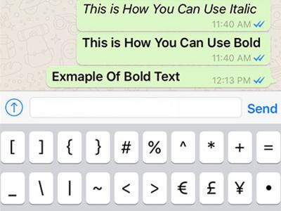 WhatsApp मध्ये एखादा मेसेज तुम्हाला Bold लेटर्समध्ये पाठवायचा असल्यास, मेसेजच्या आधी आणि नंतर * (ऐस्टरिस्क) टाइप करा. म्हणजे, तुम्हाला How are you बोल्ड लेटर्समध्ये पाठवायचे आहे. तर, *How are you* असे लिहा. जर तुम्हाला इटॅलिकमध्ये (तिरपे अक्षर) मेसेज पाठवायचा असल्यास, मेसेजच्या आधी आणि नंतर _ (अंडरस्कोर) टाइप करा. असे केल्यानंतर मेसेज इटॅलिकमध्ये जाईल.