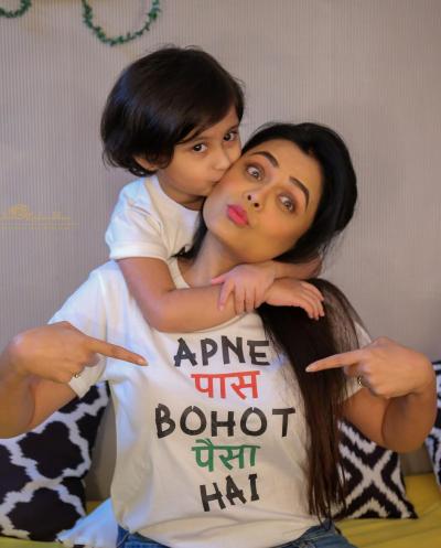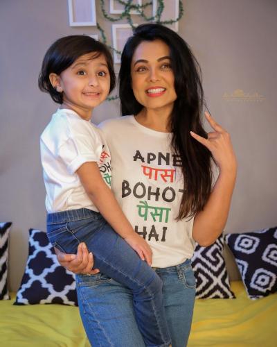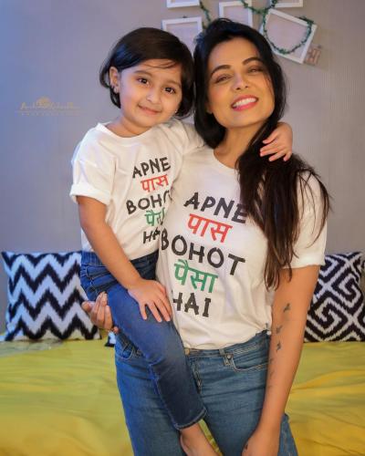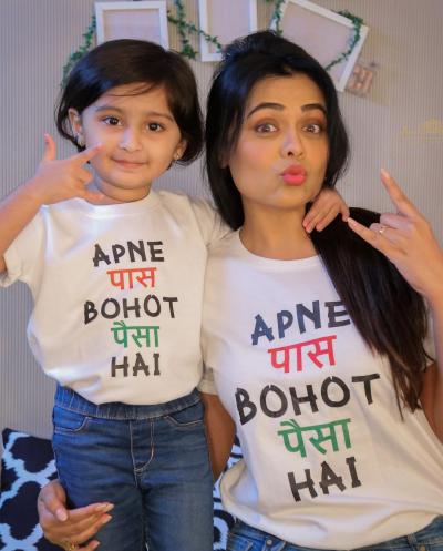या फोटोमध्ये मायरा आणि प्रार्थनाने सेम व्हाईट टी शर्ट आणि ब्लू जीन्स घातली आहे. या टी-शर्टवर मालिकेतील परी आणि नेहाचा स्पेशल डायलॉग 'अपने पास बहोत पैसा है' असं लिहिलेलं आहे.