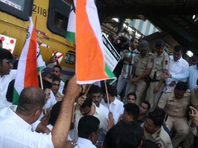 एल्फिन्स्टन रेल्वे पुलावर झालेल्या चेंगराचेंगरी दुर्घटनेबाबत प्रशासन निषेध नोंदवण्यासाठी राष्ट्रवादी काँग्रेसनं रेल रोको आंदोलन केलं