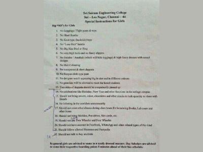 चेन्नईतील साईराम कॉलेज या इंजिनीअरिंग कॉलेजात देखील मुलींनी काय घालावे आणि काय घालू नये ह्यासंबधीचे नियम बनविण्यात आले आहेत.