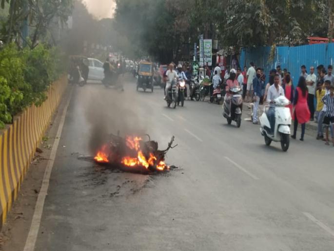 पिंपरी चिंचवड : चिंचवड गावातून आकुर्डी कडे जाणाऱ्या रस्त्यावर सायंकाळी पावणेसहा वाजता एका दुचाकीने अचानक पेट घेतल्याने सर्वांचीच धावपळ झाली. दैव बल्लतर असल्याने प्रसंगावधान पाहून चालकाने गाडी सोडुन पळ काढल्याने तो थोडक्यात बचावला.आगीच्या झळात संपूर्ण गाडी खाक झाली.हा थरार पाहण्यासाठी घटनास्थळावर मोठी गर्दी झाली होती. सायंकाळची वेळ असल्याने रस्त्यावर मोठ्या प्रमाणात वाहतूक सुरू होती. रमेश पाचपुते हे दुचाकी घेऊन आकुर्डी कडे जात होते.इंदिरा नगर चौकात येताच त्यांच्या सी डी डीलक्स (एमएच १४ डीजी ६२०१) या दुचाकीने अचानक पेट घेतला.