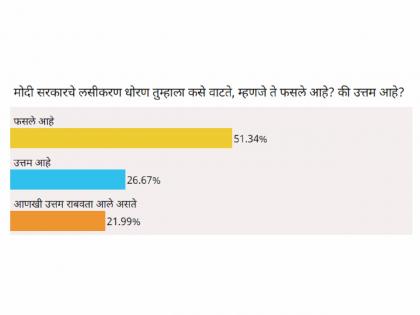 दरम्यान, सध्या सर्वात कळीचा मुद्दा ठरलेल्या कोरोना लसीकरणावरूनही जनतेने मोदी सरकारच्या कामगिरीबाबत नाराजी व्यक्त केली आहे. मोदी सरकारचे कोरोनाविरोधातील लसीकरण धोरण फसले आहे, असा कौल तब्बल ५१.३४ टक्के लोकांनी नोंदवला आहे. तर केवळ २६.६७ टक्के लोकांनी मोदी सरकारचे लसीकरण धोरण उत्तम असल्याचे म्हटले आहे. उर्वरित २१.९९ टक्के लोकांनी मोदी सरकारला हे लसीकरण अधिक चांगल्या पद्धतीने राबवता आले असते, असे म्हटले आहे.