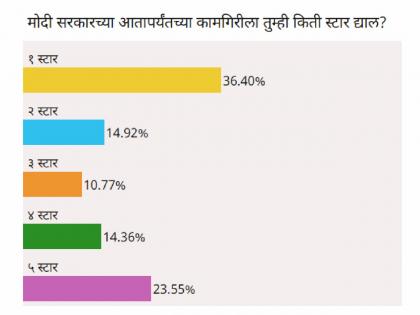 या मोदी सरकारच्या आत्तापर्यंतच्या कामगिरीला तुम्ही किती स्टार द्याल? या प्रश्नावर ३६.४२ टक्के लोकांनी १ स्टार दिला आहे. म्हणजेच ३६.४२ टक्के लोक मोदी सरकारच्या कामगिरीवर समाधानी नाहीत. १४.९३ टक्के लोकांनी २ स्टार दिलेत, १०.७८ टक्के लोकांनी ३ स्टार दिलेत. १४.३७ टक्के लोकांनी ४ स्टार दिलेत. तर २३.५० टक्के लोकांनी ५ स्टार देत मोदी सरकारच्या कामगिरीवर समाधान व्यक्त केले आहे.