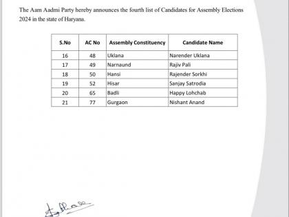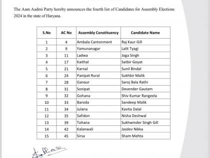 AAP Haryana Assembly election 2024 : हरियाणा विधानसभा निवडणुकीत स्वबळाचा नारा दिलेल्या आम आदमी पार्टीने चौथी यादी जाहीर केली असून, २१ उमेदवारांच्या नावांची घोषणा केली.