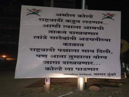 सागर डुंबरे नावाच्या या बॅनरमध्ये लिहिताना ''अमोल कोल्हे राष्ट्रवादीतून लढणार असतील तर त्यांना आम्ही आमची ताकद दाखवणार, अडचणीच्या काळात राष्ट्रवादीला साथ देणाऱ्या लांडे यांना उमेदवारी न दिल्याने कोल्हे यांना पाडण्याची भाषाही या बॅनरमध्ये केली आहे''. निवडणूक तोंडावर आलेली असताना कार्यकर्त्यांची नाराजी कोल्हे यांना परवडण्यासारखी नाही. त्यामुळे आता यावर कोल्हे आणि राष्ट्रवादीकडून काय प्रतिक्रिया होते हेच बघणे औत्सुक्याचे ठरणार आहे.