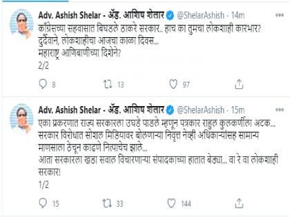 तर एका प्रकरणात राज्य सरकारला उघडे पाडले म्हणून पत्रकार राहुल कुलकर्णीला अटक केली, सरकार विरोधात सोशल मिडियावर बोलणाऱ्या निवृत्त नेव्ही अधिकाऱ्यांसह सामान्य माणसाला ठेचून काढणे नित्याचेच झाले. आता सरकारला खडा सवाल विचारणाऱ्या संपादकाच्या हातात बेड्या... वा रे वा लोकशाही सरकार! काँग्रेसच्या सहवासात बिघडले ठाकरे सरकार.. हाच का तुमचा लोकशाही कारभार? दुर्दैवाने, लोकशाहीचा आजचा काळा दिवस. महाराष्ट्र आणीबाणीच्या दिशेने? असा सवाल भाजपा नेते आशिष शेलार यांनी राज्य सरकारला विचारला आहे.