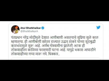 याबाबत भाजपाच्या विविध नेत्यांच्या प्रतिक्रिया येत आहेत. भाजपा आमदार अतुल भातखळकर म्हणाले की, पंतप्रधान नरेंद्र मोदींमुळे देशात आणीबाणी असल्याचे सुप्रिया सुळे काल म्हणाल्या. ही आणीबाणी खरेतर राज्यात उद्धव ठाकरे यांच्या सूडबुद्धी कारभारामुळे सुरू आहे. अर्णब गोस्वामींना झालेली अटक ही लोकशाहीला काळिमा फासणारी घटना आहे. यापुढे भकास आघाडीने लोकशाहीच्या गप्पा मारू नये. धिक्कार या शब्दात त्यांनी राज्य सरकारवर निशाणा साधला आहे.
