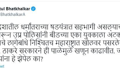 उत्तर प्रदेशातील धर्मांतराच्या षडयंत्रात सहभागी असल्याच्या आरोपावरून उत्तर प्रदेश पोलिसांनी बीडच्या एका युवकाला अटक केली आहे. त्याचे लागेबांधे निश्चितच महाराष्ट्रात खोलवर पसरलेले असणार. ठाकरे सरकारने ही पाळेमुळे खणून काढावीत. जनाब मुख्यमंत्र्यांना हे झेपेल का?, असा सवाल अतुल भातखळकर यांनी ट्विटरच्या माध्यमातून केला आहे.