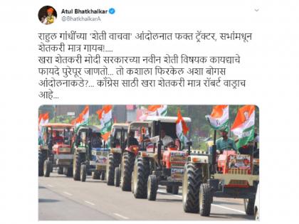 मुंबई - कृषी विधेयकांविरोधात विरोधकांसह शेतकरी संघटनांकडून आवाज उठवला जात आहे. काँग्रेसच्या वतीने पंजाबच्या मोगा जिल्ह्यातून 'शेती वाचवा' अभियान सुरू झाले आहे. या तीन दिवसीय अभियानाचे नेतृत्व काँग्रेसचे नेते राहुल गांधी करत आहेत. काँग्रेसच्या या रॅलीत मोठ्या प्रमाणात ट्रॅक्टर रस्त्यावर उतरलेले पाहायला मिळाले. मात्र शेतकऱ्यांच्या उपस्थितीबद्दल अनेकांकडून शंका उपस्थित करण्यात आली. यावरूनच भाजपा नेते आमदार अतुल भातखळकर यांनी काँग्रेसवर निशाणा साधला आहे.