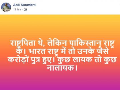 महात्मा गांधी भारताचे नव्हे, पाकिस्तानचे राष्ट्रपिता असल्याचं भाजपा नेते अनिल सौमित्र यांनी त्यांच्या फेसबुक पोस्टमध्ये म्हटलं. 'राष्ट्रपिता होते, पण पाकिस्तानचे. भारतात तर त्यांच्यासारखे कोट्यवधी पुत्र होऊन गेले. काही लायक होते, तर काही नालायक,' अशी वादग्रस्त पोस्ट सौमित्र यांनी केली. 'काँग्रेसनं त्यांना राष्ट्राचं पिता केलं. राष्ट्राचा कोणीही पिता नसतो. पुत्र असतात. चर्चमध्ये फादर असतात. काँग्रेसनं त्याचं हिंदी रुपांतर केलं,' असं सौमित्र यांनी म्हटलं.