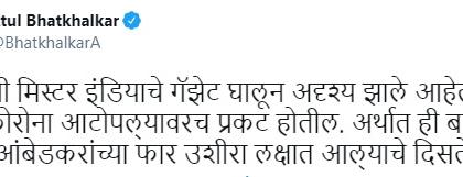 "मुख्यमंत्री मिस्टर इंडियाचे गॅझेट घालून अदृश्य झाले आहेत. ते बहुधा कोरोना आटोपल्यावरच प्रकट होतील. अर्थात ही बाब प्रकाश आंबेडकरांच्या फार उशीरा लक्षात आल्याचे दिसत आहे," असं म्हणत भातखळकर यांनी मुख्यमंत्री आणि प्रकाश आंबेडकर यांना टोला लगावला. त्यांनी ट्विटरच्या माध्यमातून त्यांच्यावर निशाणा साधला.