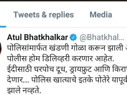 रमजान ईदनिमित्त ईदीसाठी पोलीस दूध, ड्रायफ्रूट्स आणि किराणा साहित्य घरपोच करणार असल्याचे वृत्त प्रसारमाध्यमांमध्ये झळकले होते. दरम्यान, या वृत्तावरून अतुल भातखळकर यांनी महाविकास आघाडी सरकारला टोला लगावला आहे. या संदर्भात केलेल्या ट्विटमध्ये अतुल भातखळकर म्हणाले की, पोलिसांमार्फत खंडणी गोळा करून झाली आता पोलीस होम डिलिव्हरी करणार आहेत. ईदीसाठी घरपोच दूध, ड्रायफ्रुट आणि किराणा माल देणार. पोलिस खात्याचे इतके पोतेरे यापूर्वी कधी झाले नव्हते, असा टोला भातखळकर यांनी लगावला.