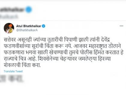 याबाबत अतुल भातखळकर यांनी ट्विट करून म्हटलंय की, सत्तेवर असूनही ज्यांच्या तुतारीची पिपाणी झाली त्यांनी देवेंद्र फडणवीसांच्या सुरांची चिंता करू नये, आजवर महाराष्ट्रात डौलाने फडकणारा भगवा खाली खेचण्याची तुमचे पोलीस हिंमत करतात हे राज्याचे चित्र आहे. शिवसेनेच्या चेहऱ्यावर जमलेल्या हिरव्या शेवळाची चिंता करा असं त्यांनी म्हटलं आहे.