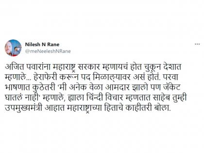 निलेश राणे यांनी आपल्या ट्विटर अकाऊंटवरून याबाबत एक ट्विट केलं आहे. तसेच अजित पवारांवर पुन्हा जोरदार टीका केली आहे. "अजित पवारांना महाराष्ट्र सरकार म्हणायचं होत चुकून देशात म्हणाले... हेराफेरी करून पद मिळाल्यावर असं होतं. परवा भाषणात कुठेतरी 'मी अनेक वेळा आमदार झालो पण जॅकेट घातलं नाही' म्हणाले, याला चिंधी विचार म्हणतात साहेब तुम्ही उपमुख्यमंत्री आहात महाराष्ट्राच्या हिताचे काहीतरी बोला" असं निलेश राणे यांनी आपल्या ट्विटमध्ये म्हटलं आहे.