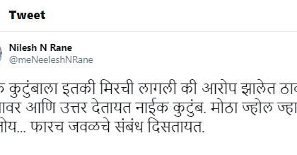 भाजपा नेते निलेश राणे यांनी यावरून आता पुन्हा एकदा ठाकरे आणि नाईक कुटुंबीयांवर निशाणा साधत हल्लाबोल केला आहे. "आरोप झालेत ठाकरे कुटुंबावर, उत्तर देतायत नाईक कुटुंब; मोठा झोलझाल, फारच जवळचे संबंध दिसतायत" असं निलेश यांनी म्हटलं आहे. निलेश राणे यांनी आपल्या ट्विटर अकाऊंटवरून याबाबत एक ट्विट केलं आहे. "नाईक कुटुंबाला इतकी मिरची लागली की आरोप झालेत ठाकरे कुटुंबावर आणि उत्तर देतायत नाईक कुटुंब. मोठा झोलझाल दिसतोय. फारच जवळचे संबंध दिसतायत" असं आपल्या ट्विटमध्ये म्हटलं आहे.