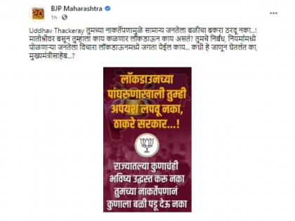 'उद्धव ठाकरे तुमच्या नाकर्तेपणामुळे सामान्य जनतेला बळीचा बकरा ठरवू नका...! मातोश्रीवर बसून तुम्हाला काय कळणार लॉकडाऊन काय असतं? तुमचे निर्बंध, नियमांमध्ये पोळणाऱ्या जनतेला विचारा लॉकडाऊनमध्ये जगता येईल काय...? कधी हे जाणून घेतलंत का, मुख्यमंत्रीसाहेब...?' असं म्हणत भाजपनं मुख्यमंत्र्यांवर निशाणा साधला. भाजपनं आपल्या सोशल मीडिया अकाऊंटवरू आनंद महिंद्रा यांच्या सल्ल्याचा संदर्भ देत त्यांच्यावर टीका केली. 'लॉकडाऊनच्या पांघरूणाखाली अपयश लपवू नका ठाकरे सरकार, राज्यात कोणाचंही भविष्य उद्ध्वस्त करू नका. तुमच्या नाकर्तेपणानं कोणालाही बळी पडू देऊ नका,' असंही भाजपनं म्हटलं आहे.