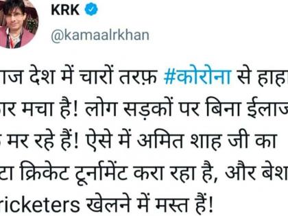 अभिनेता कमाल खान आपल्या ट्विटमध्ये म्हणाला की, आज देशात कोरोनामुळे चहुकडे हाहाकार माजलेला आहे. लोक रस्त्यांवर उपचारांविना मरत आहेत. अशा परिस्थितीत अमित शाहांचा मुलगा क्रिकेट स्पर्धेचे आयोजन करत आहे. आणि नालायक क्रिकेटपटू क्रिकेट खेळण्यात गुंग आहेत.