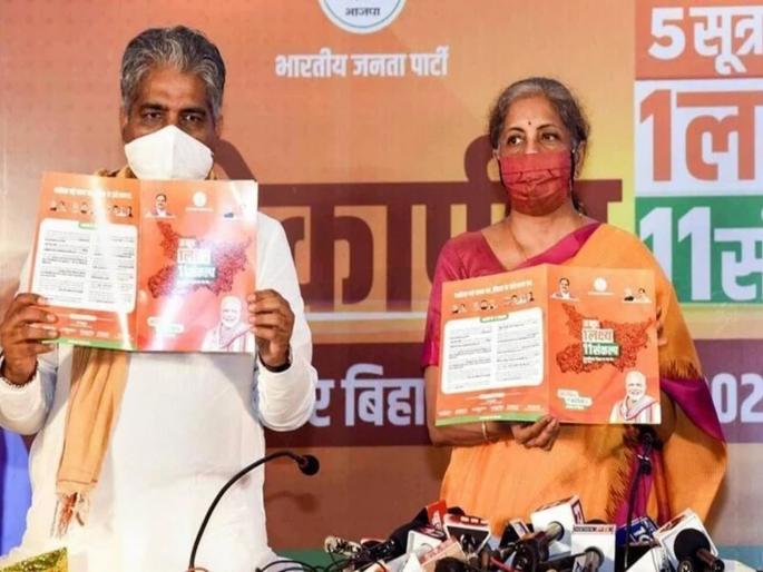 काय आहे भाजपाचा जाहीरनामा?या जाहीरनाम्यात भाजपाने ११ मोठे संकल्प केले आणि सत्तेत आल्यानंतर अनेक आश्वासने पूर्ण करण्याचा दावा केला. “भाजपा है तो भरोसा है’ ५ सूत्रे, एक लक्ष्य, ११ संकल्प' यासह भाजपाने नवीन नाराही दिला आहे. पाटण्यात जाहीरनामा जाहीर केल्यानंतर अर्थमंत्री निर्मला सीतारमण, भाजप नेते भूपेंद्र यादव आणि इतर नेत्यांनी पत्रकार परिषदेत भाषण केले. निर्मला सीतारामन यांनी माध्यमांना सांगितले की, कोरोना लस उपलब्ध होत नाही तोपर्यंत मास्क हाच उपाय आहे. परंतु ही लस येताच ती मोठ्या प्रमाणात भारतात तयार होईल. ही लस बिहारच्या लोकांना मोफत दिली जाईल असं आश्वासन भाजपानं दिलं आहे.भाजपाच्या जाहिरनाम्यातील ११ मुख्य संकल्प