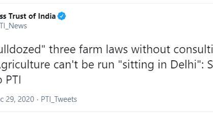 "राज्यांशी कोणतीही चर्चा किंवा त्यांचं मत जाणून न घेताच केंद्र सरकारने कृषी कायदे रेटून नेले. दिल्लीत बसून शेती करता येत नाही", असा टोला शरद पवार यांनी मोदी सरकारला लगावला आहे. ते पीटीआयशी बोलत होते.