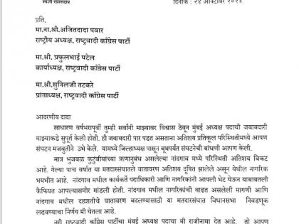 "मी आज अजित पवार, सुनील तटकरे, प्रफुल्ल पटेल यांचे आभार मानतो. त्यांनी मला मुंबईत काम करण्याची संधी दिली. मी मुंबई राष्ट्रवादी काँग्रेस अध्यक्ष पदाचा राजीनामा तिन्ही नेत्यांना पाठवला आहे", असे समीर भुजबळ म्हणाले.