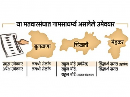 मतदारांमध्ये होऊ शकतो गोंधळ तीन मतदारसंघात एकाच नावाचे काही उमेदवार उभे आहेत. त्यामुळे मतदारांमध्ये गोंधळ निर्माण होऊन मतांची मोठी फाटाफूट होण्याची शक्यता आहे. चिखली, मेहकर, बुलढाणा मतदारसंघांत एकाच नावाचे, आडनावाचे उमेदवार उभे राहिल्याने याचा प्रमुख उमेदवारांना कितपत फटका बसू शकतो, हे निवडणूक निकालानंतरच स्पष्ट होणार आहे.