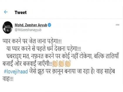 दरम्यान, मध्य प्रदेश सरकार या पावलावर बॉलिवूड अभिनेता जीशान अय्यूब यांनी भाष्य केले आहे. जीशान यांनी ट्विट करून म्हटलंय की, प्रेम केल्यावर जेल जावं लागणार आहे किंवा प्रेम करण्यापूर्वी पहिल्यांदा धर्म पाहावा लागेल, घाबरू नका, द्वेष पसरवला तर कोणीही अडवणार नाही मात्र टाळ्या वाजवतील आणि वाजवल्या जातील. लव जिहादसारख्या खोट्या प्रकरणावर कायदा बनवला जात आहे, वाह साहेब अशाप्रकारे प्रतिक्रिया दिली आहे.