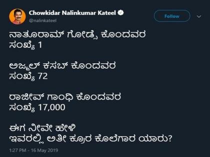 'गोडसेनं एकाला मारलं. कसाबनं 72 जणांची हत्या केली. राजीव गांधींनी 17 हजार जणांना मारलं. आता तुम्हीच ठरवा अधिक क्रूर कोण,' असं कतील यांनी ट्विटमध्ये म्हटलं. यावरुन कतील यांच्यावर सोशल मीडियानं जोरदार टीका केली. यानंतर लगेचच कतील यांनी ट्विट डिलीट केलं. 'माझ्या ट्विटमुळे कोणाच्या भावना दुखावल्या गेल्या असल्यास मी माफी मागतो. कोणाच्या भावना दुखावण्याचा माझा हेतू नव्हता. अनेकांनी त्यावर आक्षेप घेताच मी ट्विट हटवलं. आता यावरील चर्चा थांबवू या,' असं नवं ट्विट कतील यांनी केलं.