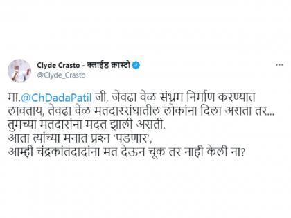 "चंद्रकांतदादांना मत देऊन चूक तर केली नाही ना?; कोथरूडमधील जनतेला प्रश्न पडला असावा" असं म्हणत क्रास्टो यांनी पाटलांवर जोरदार टीका केली आहे. क्लाईड क्रास्टो यांनी गुरुवारी (15 एप्रिल) आपल्या ट्विटर अकाऊंटवरून याबाबत एक ट्विट करत हल्लाबोल केला आहे. "चंद्रकांत पाटील जी, जेवढा वेळ संभ्रम निर्माण करण्यात लावताय, तेवढा वेळ मतदारसंघातील लोकांना दिला असता तर... तुमच्या मतदारांना मदत झाली असती. आता त्यांच्या मनात प्रश्न 'पडणार',आम्ही चंद्रकांतदादांना मत देऊन चूक तर नाही केली ना?" असं क्रास्टो यांनी आपल्या ट्विटमध्ये म्हटलं आहे.