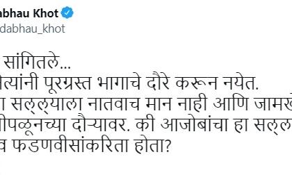 "आजोबांनी सांगितलं राजकीय नेत्यांनी पूरग्रस्त भागाचे दौरे करून नयेत. आजोबांच्या सल्ल्याला नातवाचाच मान नाही आणि जामखेडचे आमदार चिपळूणच्या दौऱ्यावर. आजोबांचा हा सल्ला फक्त राज्यपाल व फडणवीसांकरिता होता का?," असा सवाल सदाभाऊ खोत यांनी केला आहे. त्यांनी ट्विटरच्या माध्यमातून रोहित पवारांना टोला लगावला.