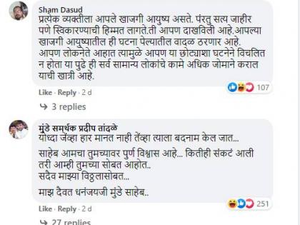 अनेकांनी धनंजय मुंडे यांच्या कारकिर्दीचा आढावाच कमेंटमध्ये मांडून त्यांनी केलेल्या संघर्षाची माहिती देऊ केलीय. तर काहींनी धनंजय मुंडेंनी स्वत:हून समोर येऊन संबंधित महिलेसोबतच्या संबंधांची कबुली देऊन वस्तुस्थिती मांडल्याबाबत त्यांच्या पाठिशी उभं राहणं पसंत केलं आहे.