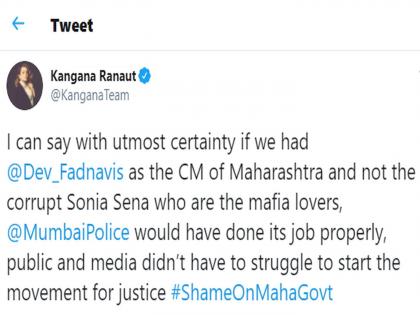 मुंबई: अभिनेता सुशांत सिंह राजपूत प्रकरणावरून आक्रमक झालेल्या अभिनेत्री कंगना राणौतचे ठाकरे सरकारवरील हल्ले सुरूच आहेत. महाराष्ट्र सरकार बॉलिवूडमधील ड्रग्ज माफियांना पाठिशी घालत असल्याचं मुंबईशी तुलना थेट पाकव्याप्त काश्मीरशी करणारी कंगना दररोज ठाकरे सरकारवर निशाणा साधत आहे. देवेंद्र फडणवीस मुख्यमंत्री असते, तर सुशांत सिंह राजपूत मृत्यू प्रकरणाचा व्यवस्थित झाला असता, असं कंगनानं ट्विटमध्ये म्हटलं आहे.