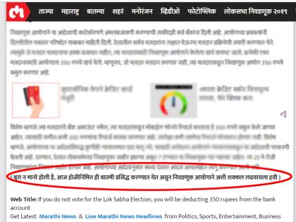 लोकसभा निवडणुकीत मतदान न केल्यास संबंधित व्यक्तीच्या खात्यातून ३५० रुपये वजा होतील, ही 'लोकमत डॉट कॉम'वरील बातमी 'बुरा न मानो होली है', या स्वरूपाची होती. मतदान न करणाऱ्या व्यक्तीकडून असा कुठलाही दंड वगैरे आकारला जाणार नाहीए. तसा कुठलाही निर्णय निवडणूक आयोगाने घेतलेला नाही. निव्वळ करमणूक करणं, मनोरंजन हाच आमच्या बातमीमागचा हेतू होता. परंतु, या बातमीचा राजकीय वापर होत असल्याचं लक्षात आल्यानं आम्ही हा खुलासा करत आहोत.