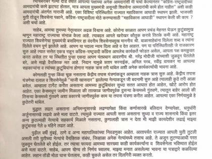सरनाईक यांनी त्यांच्या पत्रात महाविकास आघाडी सरकारमधील काही मंत्र्यांवर गंभीर आरोपदेखील केले आहेत. 'तुम्ही मुख्यमंत्रीपदाला प्रामाणिकपणे न्याय देत असताना दुसरीकडे काँग्रेस, राष्ट्रवादीमुळे शिवसेनेचा मुख्यमंत्री झाला, असं काँग्रेस, राष्ट्रवादीच्या लोकांना वाटतं. त्यात काँग्रेस पक्ष एकला चलो रेची भूमिका घेत आहे. तर राष्ट्रवादी दुसऱ्या पक्षाचे नेते-कार्यकर्ते फोडण्यापेक्षा शिवसेनेचे नेते-कार्यकर्ते फोडत असल्याचं चित्र दिसत आहे. महाविकास आघाडीतील काही मंत्री आणि काही सनदी अधिकारी केंद्रीय तपास यंत्रणेचा ससेमिरा पाठीमागे लागू नये म्हणून केंद्रातील पक्षासह आपल्या नकळत छुपी हातमिळवणी करत आहेत,' असा खळबळजनक दावा त्यांनी पत्रात केला आहे.