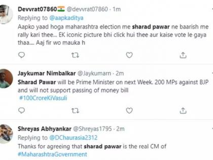 एका युजरने तर शरद पवार पुढील आठवड्यात महाराष्ट्राचे पंतप्रधान बनतील अशी भविष्यवाणीच करून टाकली आहे. मनी बिलवरून भाजपाच्या विरोधात 200 खासदार आहेत. हे बिल पास करण्यासाठी ते समर्थन देणार नाहीत. असे म्हटले आहे.