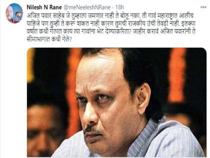 त्यावर निलेश राणे म्हणाले आहेत की, अजित पवार साहेब जे तुम्हाला जमणार नाही ते बोलू नका. ती गावं महाराष्ट्रात आलीच पाहिजे पण तुम्ही ते करू शकत नाही कारण तुमची राजकीय उंची तेवढी नाही. इतक्या वर्षात त्या गावांना भेट देण्याकरिता कधी गेलात का? अजित पवार सीमाभागात कधी गेले हे त्यांनी जाहीर करावं असं आव्हान राणेंनी अजितदादांना दिलं आहे. त्यामुळे निलेश राणेंच्या या विधानावर राष्ट्रवादी काँग्रेस काय प्रतिक्रिया देतं हे पाहणं गरजेचे आहे.