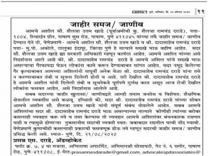 याबाबत शैलजा दराडे यांना आपल्या भावाचा हा उद्योग समजल्यावर त्यांनी वर्षभराने आपला भावाशी काहीही संबंध नाही. दादासाहेब दराडे हा सखा भाऊ असल्याचा गैरफायदा घेऊन लोकांना कामे करुन देण्याबाबत सांगत आहेत. शैलजा खाडे यांनी त्याच्याशी संबंध तोडलले आहे. त्यामुळे दादासाहेब दराडे भाऊ असल्याच्या नात्याने कोणीही त्याच्याबरोबर कसलाही व्यवहार करु नये, अशी जाहीर नोटीस ऑगस्ट २०२० मध्ये दिली होती. पोलिसांनी दोघांवरही गुन्हा दाखल केला असून सहायक पोलीस निरीक्षक थोरबोले अधिक तपास करीत आहेत.