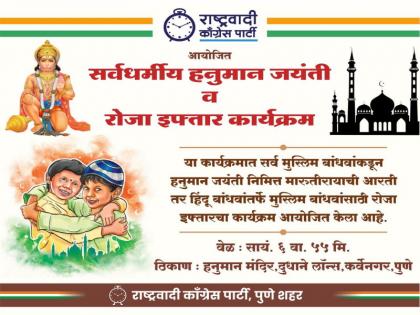 राष्ट्रवादी आयोजित कार्यक्रमात सर्व मुस्लिम बांधवांकडून हनुमान जयंतीनिमित्त मारुतीरायाची आरती करण्यात येणार आहे. तर हिंदू बांधवांतर्फे मुस्लिम बांधवांसाठी रोजा इफ्तारचा कार्यक्रम आयोजित करण्यात आला आहे. या कार्यक्रमाला राष्ट्रवादी काँग्रेसचे प्रदेशाध्यक्ष जयंत पाटील उपस्थित राहणार असल्याची माहिती राष्ट्रवादीच्या पदाधिकाऱ्यांनी दिली आहे.