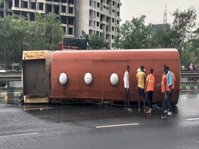 नवले पुलाजवळ अपघात; टँकर उलटला, चोवीस हजार लिटर खोबरेल तेल रस्त्यावर