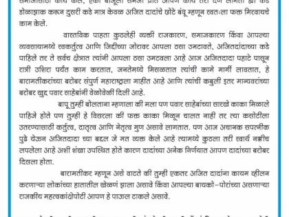 बारामतीकर म्हणून असे वाटते की तुम्ही एकतर अजित दादांना कायम व्हीलन करणाऱ्या लोकांच्या हातातील खेळणं झाला असावे किंवा आपल्या बायको-पोरांच्या असणाऱ्या राजकीय महत्वकांक्षेपोटी आपण हे पाऊल टाकले असावे.