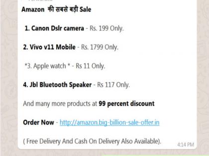 गेल्या काही दिवसांपासून अॅमेझाॅन या नामांकित वेबसाईटच्या नावाने अॅमेझाॅन की सबसे बडी सेल अशा शिर्षकाचा एक मेसेज व्हाॅट्सअॅपवर फिरत अाहे. त्यात कॅनाॅन चा कॅमेरा केवळ 199 रुपये, व्हिवाे कंपनीचा माेबाईल 1799 रुपये, अॅपल कंपनीचे घड्याळ केवळ 11 रुपयांना तर जेबिएलचे स्पिकअर हे 117 रुपयांना असल्याचे म्हंटले अाहे. या मेसेजच्या खाली एक लिंक देण्यात अाली अाहे. त्या लिंकवर क्लिक करुन अाॅर्डर करण्याचे अावाहन करण्यात अाले अाहे. त्याचबराेबर फ्रि डिलिव्हरी अाणि वस्तू मिळाल्यावर पैसे भरण्याची साेय असल्याचेही यात म्हणण्यात अाले अाहे. हा मेसेज खाेटा असल्याचे सायबर तज्ञांचे म्हणणे अाहे. अॅमेझाॅनचे नाव वापरुन खाेटी वेबसाईट तयार करुन नागरिकांची माहिती चाेरण्यात येत अाहे. हा मेसेज खरा समजून नागरिक वस्तू अाॅर्डर करीत अाहेत. परंतु यामुळे नागरिकांची वैयक्तिक माहिती चाेरीला जाण्याची शक्यता निर्माण झाली अाहे.