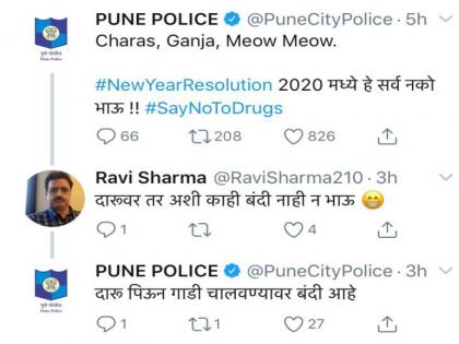 याबाबत अधिक माहिती अशी की, पुणे पोलिसांनी अंमली पदार्थ म्हणजे चरस, गांजा यांना २०२०साली निरोप देऊ असे ट्विट केले. त्यावर एका युजरने दारूवर बंदी नाही ना असा प्रश्न केला. त्यावर हार न मानता पुणे पोलिसांनी दारू पिऊन गाडी चालवण्यावर बंदी आहे असे पुणेरी उत्तर दिले.
