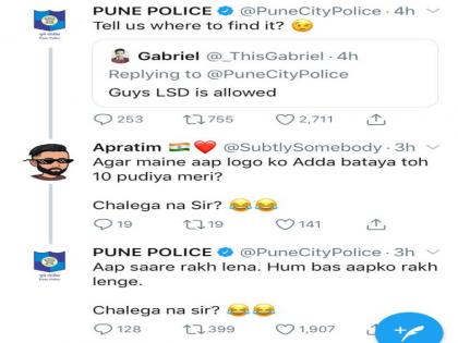 त्याच ट्विटला एका युजरने उत्तर देताना. 'मित्रांनो एलएसडी'ला परवानगी आहे' असे ट्विट केले. त्यावर पोलिसांनी ते कुठे मिळेल असे विचारले. त्यावर एका अतिहुशार युजरने मी तुम्हाला अड्डा सांगितलं तर १० पुड्या मला देणार का असा प्रश्न विचारला. पोलिसांनी यावर चाणाक्ष उत्तर देताना तुम्ही सगळ्या पुड्या ठेवून घ्या, आम्ही तुम्हाला ठेवून घेऊ असे उत्तर त्याला गप्प केले.