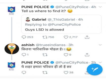 अजून एका युजरने कितना पारिवारिक माहोल है असा टोमणाही मारला पण त्यावरही पोलिसांनी 'ये शहर हमारा परिवार ही तो है सर' असं सणसणीत उत्तर दिलं.या सर्व संभाषणाचे स्क्रीन शॉट्स व्हायरल झाले असून अनेकांनी पुणे पोलिसांचे कौतुक केले आहे.