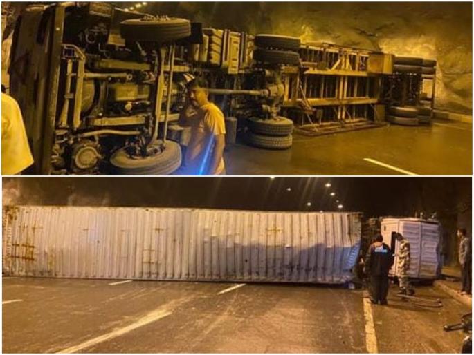 लोणावळा :मुंबई-पुणे द्रुतगती मार्गावरील खंडाळा बोगद्यात एक कंटेनर आडवा झाल्याने संपूर्ण बोगदा बंद झाला आहे. पुण्याहून मुंबईच्या दिशेने जाणार्या मार्गावरील बोगद्यात ही घटना सकाळी सव्वा अकरा वाजता घडली आहे. यामुळे मुंबईच्या दिशेने जाणारी सर्व वाहतूक बंद झाली आहे. घटनेची माहिती समजताच आयआरबी व देवदूत यंत्रणा घटनास्थळी पोहचली आहे मात्र त्यांना सुद्धा घटनास्थळी जाताना अमृतांजन पुलापर्यत जाऊन उलट्या दिशेने जावे लागले.