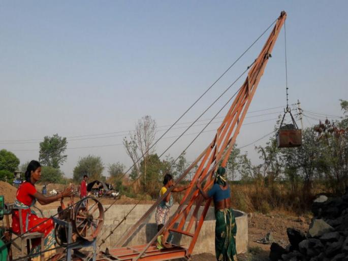 चाकण : पोटाची खळगी भरण्यासाठी प्रत्येकजण आपआपल्यापरीने कष्ट मोजत असतो. यात आत्ताच्या काळानुसार, महिला देखील पुरुषांच्या बरोबरीने खांदा लावून पडेल ते काम करण्यात तत्परता दाखवत आहे. याच गोष्टीचा प्रत्यय तुम्हाला खान्देशातून विहीर खोदकाम करण्यासाठी चाकण येथे आलेल्या कुटुंबातील महिलांकडे पाहून येतो. कारण या कुटुंबातील काही महिला चक्क महिला क्रेन चालवित आहे.विदर्भ, मराठवाडा व खान्देशातील दुष्काळी परिस्थितीमुळे या भागातून अनेक कुटुंबे रोजगारासाठी पुणे जिल्ह्यात आलेली आहे. अनेक तरुणांनी चाकण औद्योगिक कंपन्यांमध्ये नोकऱ्याही मिळवल्या आहे. तर अनेक कुटुंबे कष्टाचे काम करून आपला उदरनिर्वाह करतानाचे चित्र या परिसरात दिसत आहे. कडाचीवाडी येथील माजी उपसरपंचाच्या विहीर खोदकाम सुरु असून या कामासाठी जळगाव जिल्ह्यातील जाधव व झाकणे ही दोन कुटुंब आपल्या मुलाबाळांसह आली आहे. त्यांनी शेतातच तंबू टाकून आपला संसार मांडला असून या कुटुंबातील महिला अक्षरश: उरा पोटावर दगड उचलून क्रेनमध्ये भरतात व महिलाच क्रेन चालवत आहे. पुरुषांच्या खांद्याला खांदा लावून काम करणाऱ्या या महिलांचे कष्ट पाहण्यासाठी परिसरातील लोक गर्दी करत आहे. या घटनेने १९७२ च्या दुष्काळातल्या कामांचीच एकप्रकारे आठवण झाली. त्यावेळी देखील लोकांनी मिळेल ते काम करत कुटंबाचा उदरनिर्वाह केला. यातूनच खेड तालुक्यात सर्वाधिक विहिरी व पाझर तलाव खोदकामे झाली. ==================