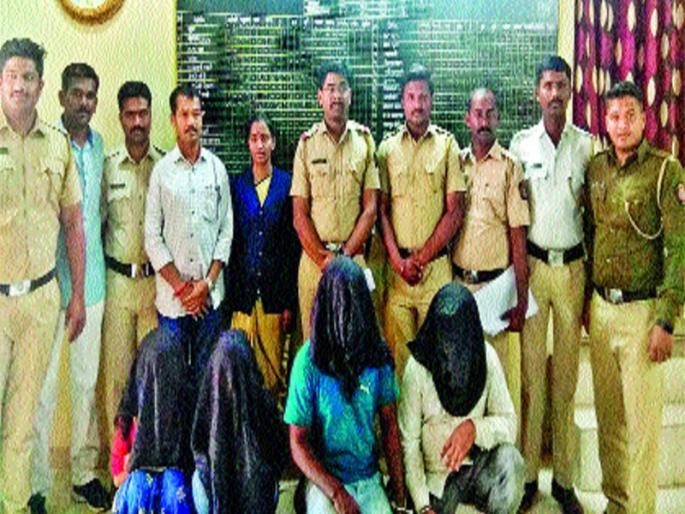 पंकज मिसाळ (वय २८, रा. निमगाव केतकी, इंदापूर), राहुल चव्हाण (वय २०, रा. मदनवाडी, ता. इंदापूर), अंकिता भोसले (वय २९), प्रज्ञा भोसले (वय २१ , दोघीही रा. बारामती) यांना अटक करण्यात आली आहे, तर ओंकार शितोळे (रा. पाटस , ता. दौंड), दादा (पूर्ण नाव समजू शकले नाही, रा. इंदापूर) हे दोघे फरार झाले आहे. शनिवारी सायंकाळी ७.३० च्या सुमारास गिरीम फाटा येथील साई पॅलेस हॉटेलजवळ एका गाडीतून ४ तरुण आणि २ तरुणी उतरल्या. दरम्यान, या वेळी त्यांनी हॉटेलच्या काउंटरला घेरा घातला. यावेळी त्यांनी हॉटेल व्यावसायिकाला तुमच्या हॉटेलमध्ये अवैध व्यवसाय सुरू असतो. आम्ही वरिष्ठ पोलीस अधिकारी आहोत, असे सांगून यातील एकाने काउंटरच्या गल्ल्यात हात घालून ३० हजार काढून घेतले. तुला प्रकरण मिटवायचे असेल तर १ लाख रुपये द्यावे लागतील असे सांगितल. अंकिता भोसले हिच्याकडे भारत अगेन्स्ट करप्शन या संस्थेचे ओळखपत्र होते. ओळखपत्र हॉटेलचालकाला दाखविले. यानंतर त्याने २५ हजार रुपये दिले. यानंतर ते पैसे घेऊन ते पसार झाले. हॉटेलमध्ये झालेल्या गोंधळावरून हॉटेलचालक चंद्रशेखर रेड्डी (रा. गजानन सोसायटी, दौंड) यांना शंका आल्याने त्यांनी तोतया पोलिसांच्या गाडीचा पाठलाग केला.