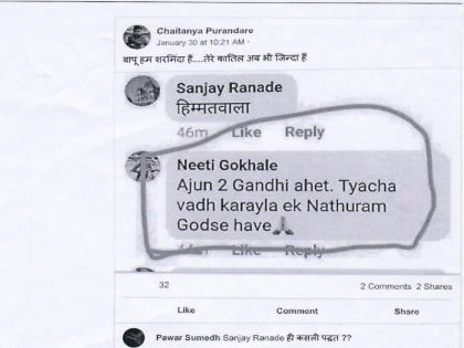 महात्मा गांधी यांच्या पुन्यतिथी दिनी 30 जानेवारी राेजी अलिगड येथे हिंदू महासभेच्या काही कार्यकर्त्यांनी महात्मा गांधी यांच्या प्रतिकात्मक पुतळ्यावर गाेळ्या झाडून नथुराम गाेडसेच्या समर्थनार्थ घाेषणा दिल्या हाेत्या. या घटनेचे तीव्र पडसाद संपूर्ण देशात उमटले हाेते. या घटनेचा व्हिडीओ माेठ्याप्रमाणावर व्हायरल झाला हाेता. पुरंदरे यांनी आपल्या वाॅलवर 30 जानेवारी राेजी बापू हम शर्मिंदा हैं....तेरे कातिल अभी भी जिंदा हैं अशी पाेस्ट टाकली हाेती. या पाेस्टवर नीती गाेखले नामक महिलेने कमेंट करत अजून दाेन गांधी आहेत. त्यांचा वध करायला एक नथुराम गाेडसे हवे अशी कमेंट केली आहे. या महिलेच्या विराेधात शहर काॅंग्रेसकडून आता शिवाजीनगर पाेलीस स्टेशनमध्ये तक्रार दाखल केली आहे.