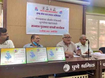 पुण्यात राष्ट्र सेवा दलाचे माजी अध्यक्ष व विश्वस्त प्रकाश कांबळे यांनी सोमवारी(दि. ९) क्रांती दिनाच्या दिवशी पत्रकारांशी संवाद साधत आपली भूमिका मांडली. यावेळी सेवादल सैनिक मिहीर थत्ते, सुहास कोते, जीवराज सावंत आदी महाराष्ट्रभरातील कार्यकर्ते उपस्थित होते.